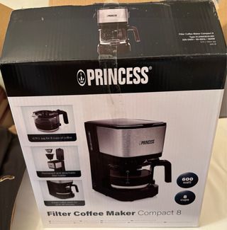 Cafetera de filtro Princess Compact 8, ideal para preparar hasta 8 tazas de café. - Capacidad de 0.75 L. - Jarra de cristal. - Soporte de filtro permanente y extraíble. - Mantiene el café caliente hasta 40 minutos. - Potencia de 600W.
