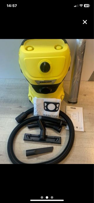 Aspirador Karcher a bateria para sólidos y líquidos, completamente nuevo. - Incluye manguera y accesorios. - Bolsa para el polvo. No incluye batería.