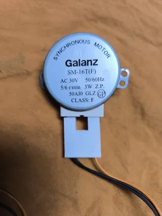 Motor síncrono Galanz modelo SM-16T(F). - Voltaje: AC 30V. - Frecuencia: 50/60Hz. - Velocidad: 5/6 r/min. - Potencia: 3W Z.P. - Clase: F.