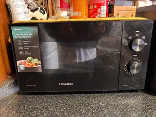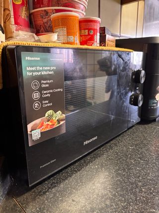 Microondas Hisense en color negro con acabado en cristal premium. - Cavidad con recubrimiento cerámico. - Control fácil de usar.