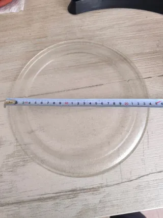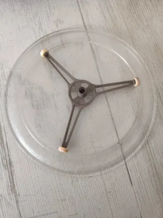 Plato de cristal para microondas con su soporte giratorio. - Plato de vidrio transparente de 24 ctms de diámetro - Soporte de plástico marrón con tres ruedas.