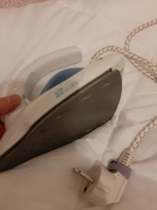 Plancha de ropa compacta, ideal para llevar de viaje. Permite planchar con vapor para eliminar arrugas. Con funda de viaje, usada dos veces. - Diseño blanco y azul. - Mango ergonómico. - Base antiadherente.