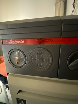Caldera de gasoil marca Perfoli. Dispone de varios indicadores y mandos en la parte superior. - Color gris y rojo. - Diseño robusto.