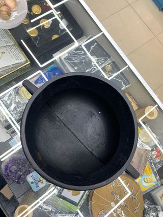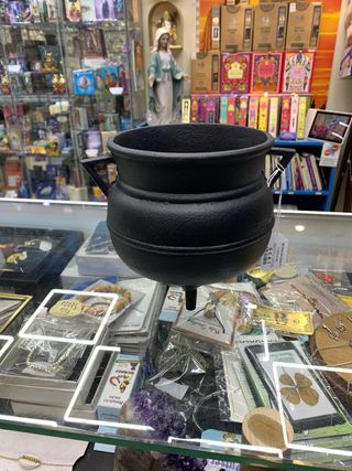 Caldero de hierro negro con asas y patas. - Material: Hierro. - Color: Negro. - Capacidad aproximada: 2 litros.
