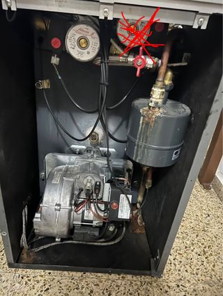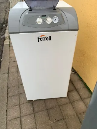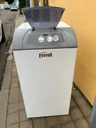 Caldera de la marca Ferroli que necesita una revisión y ajuste. Presenta una fuga de agua. - Modelo de caldera Ferroli. - Requiere mantenimiento.