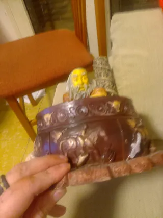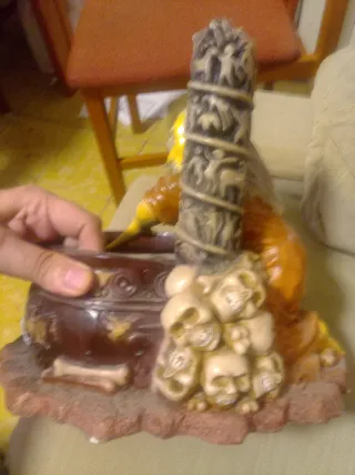 Figura decorativa de un mago con su caldero y un montón de calaveras. - Detalle de figuras humanas y animales en espiral en el poste. - Caldero de cerámica con diseño. - Base con calaveras y huesos.