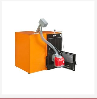 Caldera mixta para pellets y leña. - Diseño moderno en naranja y negro. - Incluye quemador. Se regala termo de agua de 150 litros