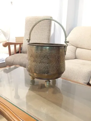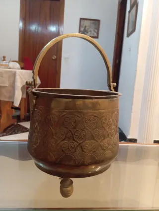 Caldera antigua de latón con un diseño muy detallado y decorativo. - Material: Latón. - Grabados florales y geométricos. - Asa superior. - Base con pie decorativo.