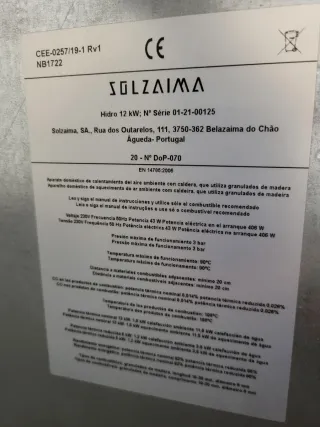 Estufa y caldera de pellet Solzaima modelo Hidro 12 kW, prácticamente nueva. Diseñada para calentar el aire ambiente utilizando granulados de madera. Con bomba de agua. - Potencia nominal: 12 kW. - Voltaje: 230V. - Frecuencia: 50Hz. - Potencia eléctrica: 43W. - Presión máxima de funcionamiento: 3 bar. - Temperatura máxima de funcionamiento: 90°C. - Distancia a materiales combustibles adyacentes: mínimo 20 cm. - Rendimiento energético: 92% potencia nominal. - Combustible: granulados de madera, longitud 10-30 mm, diámetro 6 mm.