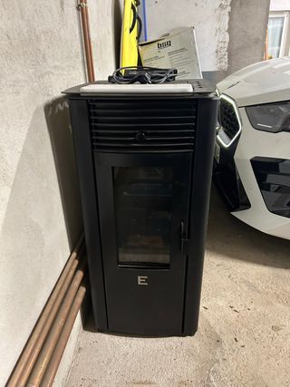 Caldera Ecoforest de agua para suelo radiante, radiadores, puede quemar pellet, hueso de aceituna y almendra. 24kw, dos salidas y dos retornos para dos circuitos. Funciona a la perfección, muy bien cuidada. Ella sola calentaba de sobras una vivienda de 120m2 con suelo radiante y otra de 120m2 con radiadores. Recién repasada y se le ha cambiado la CPU e instalado nuevo software mucho más automatizado y con conexión remota. Hay tubos y piezas de chimenea acero inox, doble capa(cada metro de tubo vale más de 100€). Si alguien quiere fotos por privado, hasta que me desplace al almacén donde la guardo y las pueda colgar.