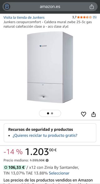 Caldera mural de gas natural Junkers. - Modelo Cerapurcomfort. - Clase energética A para calefacción y ACS. es una caldera de gas de condensación mural Junkers Cerapur. Es un modelo de caldera eficiente y silencioso, con un nivel sonoro de aproximadamente 35 decibelios. Diseñada para proporcionar calefacción y agua caliente sanitaria (ACS). Cuenta con mandos analógicos y un pequeño display para un manejo sencillo y la visualización de códigos de error. Incorpora el sistema "Quick Tap" para un suministro de agua caliente más rápido y eficiente. Prepara para ser compatible con termostatos inalámbricos o Wi-Fi para optimizar el