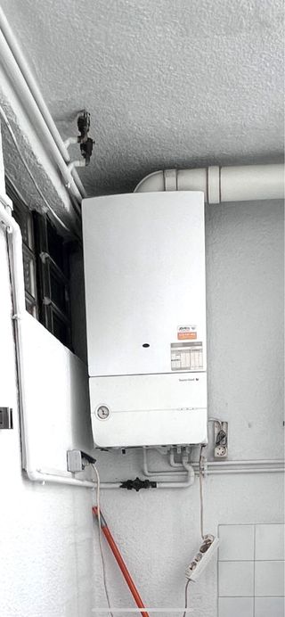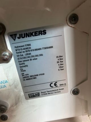 Caldera Junkers de gas natural en color beige y blanco. Se encuentra en funcionamiento. - Modelo de la marca Junkers. - Diseñada para gas natural.