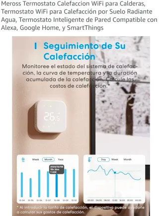 Termostato inteligente Meross para calefacción WiFi. Permite el control de calderas, suelo radiante y agua caliente sanitaria. Compatible con Alexa, Google Home y SmartThings. Pvp 50 NUEVO - Seguimiento de calefacción con monitorización del sistema. - Visualización de curva de temperatura y duración acumulada. - Cálculo de costes de calefacción (requiere introducir tarifa). - Diseño moderno e intuitivo.
