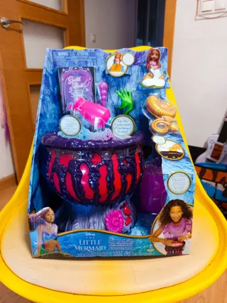Caldero mágico de Ursula, de la película La Sirenita de Disney. ¡Prepárate para la magia! NUEVO. - Incluye caldero con luces y sonidos. - Contiene pociones y accesorios. - Ideal para jugar a ser Ursula. - Incluye un libro de hechizos, dos muñecas, accesorios y más. ¡Perfecto para jugar a ser bruja! - Caldero con detalles en purpura y rosa. - Incluye dos muñecas pequeñas. - Contiene un libro, accesorios y otros elementos temáticos.