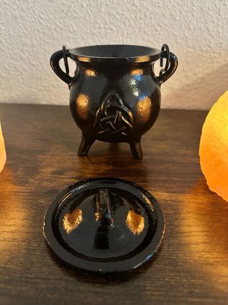 Pequeño caldero decorativo de hierro con diseño Trisquel. - Material: Hierro. - Diseño: Símbolo Trisquel en relieve. - Color: Negro. Aprox 10cm x 7cm diámetro