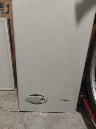 Caldera de gas de la marca Fer, en color blanco. Está en buen estado. - Dispone de dos mandos para regular la temperatura. - Incluye un manómetro para controlar la presión del gas. Se puede adaptar para butano. Buen estado,solo se ha usado seis meses por cambio a termo eléctrico