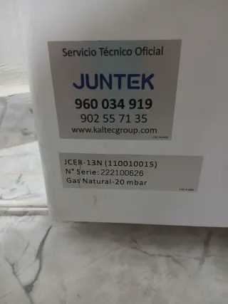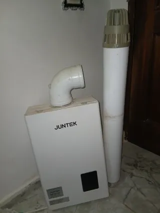 Calentador de gas natural JUNTEK. - Color blanco y gris. - Incluye tubo de salida de humos.