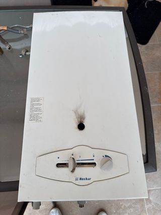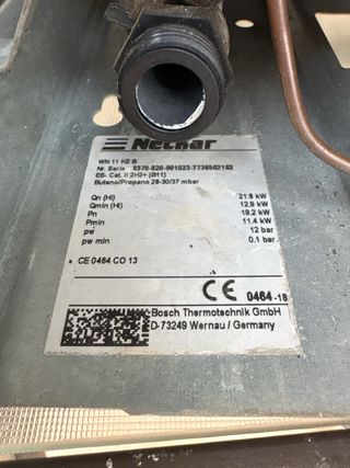 Termo de gas marca Neckar, modelo WRN10-4 KB R 31 NE. No usado, instalado y desinstalado en la misma mañana por no ser comoatible con sistema de deposito de placa solar. - Capacidad de 10 Litros. - Diseñado para Butano/Propano 28-30/37 mbar. - Incluye accesorios de instalación. - Cumple con la normativa ES- Cat. II 2H3+ (B11BS). - Fabricado en España.