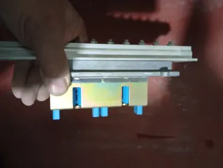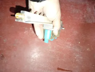 Componente de gas con conexiones metálicas y detalles en azul. - Conexión principal dorada. - Múltiples terminales de conexión.