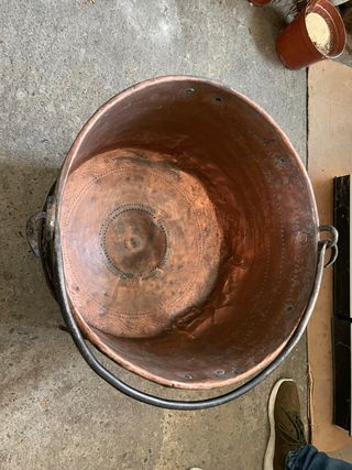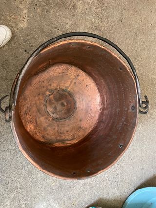 Antiguo caldero de cobre con asas. - Material: Cobre. - Diseño martillado en el interior. - Asas decorativas de metal.