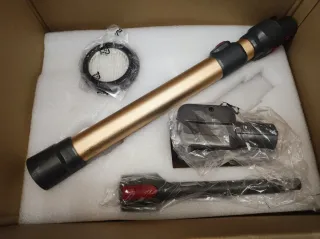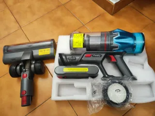 aspirador sin cable en color dorado. Incluye accesorios. - Tubo principal de metal dorado. - Accesorios de plástico negro y rojo. - Filtro circular blanco. Poco uso en buenas condiciones. Precio nuevo 159e. Está en Santa Coloma de Farnés
