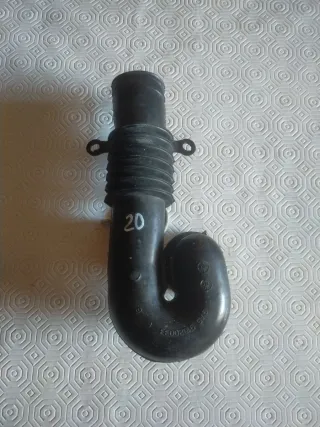 Manguito de lavadora, también conocido como jabonera o cuba. - Pieza de goma negra. - Con número 20 escrito. - Tiene un diseño curvo y flexible.