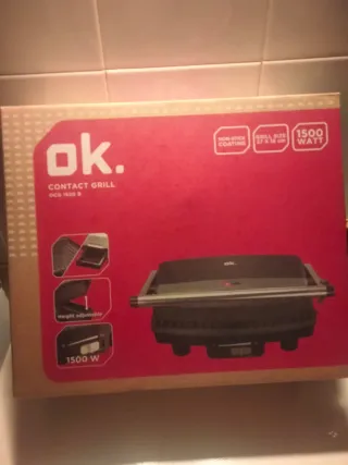 Contact grill de la marca OK, modelo OCB 1520 B. Cuenta con recubrimiento antiadherente y tamaño de parrilla de 27 x 18 cm. - Potencia de 1500W. - Altura ajustable. - Nuevo a estrenar