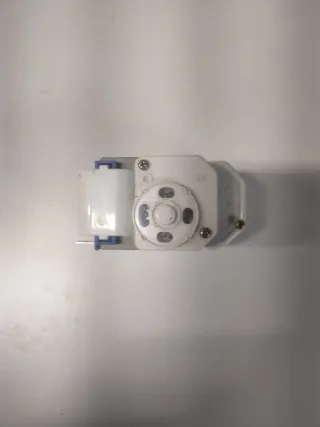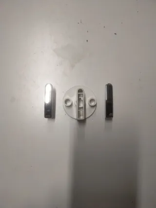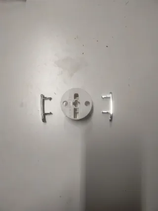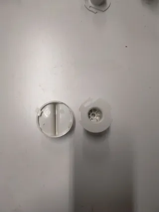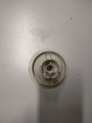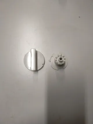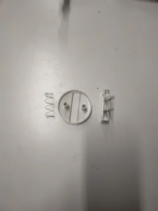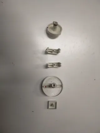 Componentes para mando programador de lavadora Rommer. Incluye el dial principal, un resorte y una pieza de plástico. - Dial redondo con ranura central. - Resorte metálico. - Pieza de plástico con dos salientes.