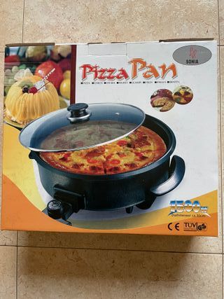 Sartén eléctrica marca Sonia, modelo Pizza Pan, ideal para preparar pizzas y otros platos. - Potencia de 1500W. - Diámetro aproximado de 30cm. - Incluye tapa de cristal. - Apta para PIZZA, GYROS, STEAKS, WURST, SCAMPI, FISCH, PAELLA, BRATEN.