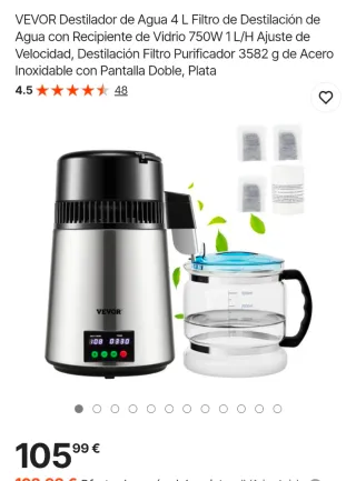 VEVOR Destilador de Agua 4 L Filtro de Destilación de Agua con Recipiente de Vidrio 750W 1 L/H Ajuste de Velocidad, Destilación Filtro Purificador 3582 g de Acero Inoxidable con Pantalla Doble, Plata Purificación de Agua Eficiente: El elemento calefactor de 750 vatios permite que nuestro destilador de agua doméstico produzca hasta 1 L (0,3 galones) por hora y aproximadamente 24 L por día. Puede disolver con eficacia sólidos, COV y otras impurezas, ofreciéndole agua destilada pura para beber con tranquilidad. Además de destilar agua, también se puede usar para hacer alcohol y aceite esencial. Perfecto para oficinas, hogares, laborat