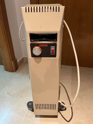 Calefactor radiador de aceite Zanussi en color beige. Cuenta con ruedas para facilitar su movilidad. El calefactor funciona correctamente aunque el termostato no hace su función y hay que estar pendiente de apagarlo manualmente según la temperatura deseada.
