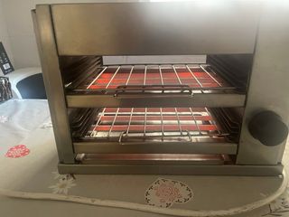 Tostador eléctrico de acero inoxidable, ideal para uso profesional. - Dos niveles de rejilla. - Elementos calefactores visibles. - Panel de control con botón y selector giratorio.