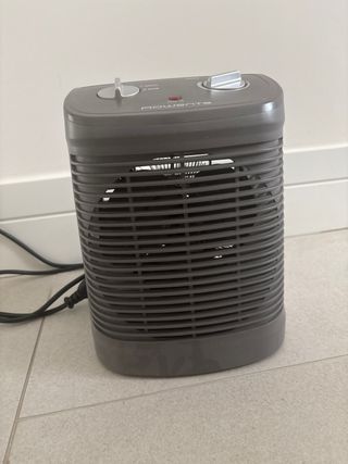 Calefactor Rowenta de color gris, con diseño moderno y compacto. Ideal para calentar estancias. - Potencia de 2000W. - Dos niveles de potencia. - Termostato regulable. - Función de ventilador. - Indicador luminoso de encendido.