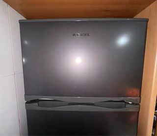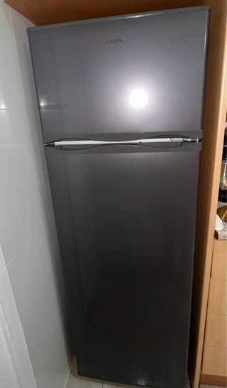 Nevera combi de tamaño pequeño a mediano, con congelador en la parte superior. Su diseño es moderno y funcional. - Color gris. - Congelador arriba. - Medidas aproximadas: 145 × 55 × 55 cm