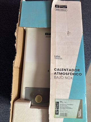 Calentador atmosférico de agua a gas de la marca Gils. - Capacidad de 11 litros. - Modelo Bajo NOx. - Encendido automático. - Instalación tipo B11 exterior. - Apto para Butano/Propano. Lo probe y no me iba bien en mi casa, no se ha usado mas pero perdi el ticket, trnia muchas obras en casa y ahi se quedo.