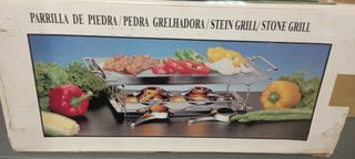 plancha a la piedra para cocinar carne, verduras, pescado, etc. Lleva 2 recipientes para fundir queso o calentar salsas. Tamaño pequeño, se puede poner en el centro de la mesa para hacer la comida al gusto.