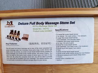 Set de piedras para masaje profesional. Incluye un calentador para mantener las piedras a la temperatura ideal. - Set de 60 piezas. - Piedras para masaje de cuerpo completo. - Caja de madera de bambú.