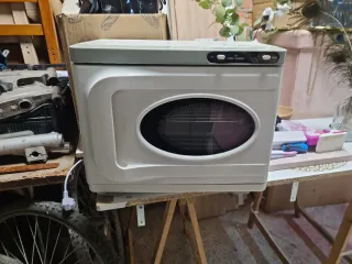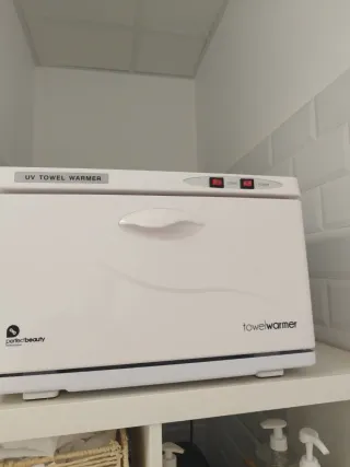Calentador y esterilizador de toallas para uso en estética. - Diseño compacto y moderno. - Ventana frontal para visualización. - Asa lateral para apertura. Con Luz ultravioleta para desinfectar al mismo tiempo que calienta. Tiene muy poco uso.