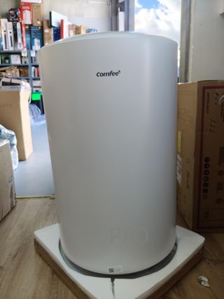 Termo eléctrico de color blanco, con un diseño cilíndrico y moderno. Cuenta con un panel de control en la parte frontal inferior. - Capacidad de 100L. - Instalación Vertical. - Calentamiento rápido y eficiente. - Perfecto para hogares, locales o uso profesional. Ideal para garantizar suministro constante de agua caliente para varias personas o actividad profesional. El termo está en buen estado y funcionando correctamente.