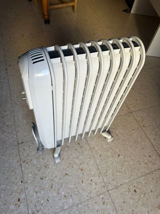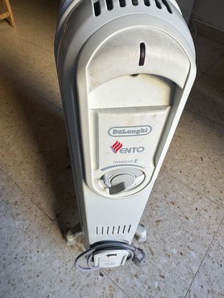 Calentador eléctrico de la marca Delonghi, ideal para mantener una temperatura agradable en cualquier estancia. - Diseño compacto y fácil de mover. - Ruedas para su desplazamiento. - Color blanco.