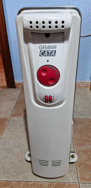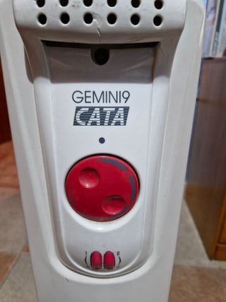 Radiador eléctrico de la marca CATA, modelo Gemini 9. Un calentador eficiente para tu hogar. - Diseño en color blanco. - Panel de control con dial giratorio y botones. - Indicadores de potencia I y II.