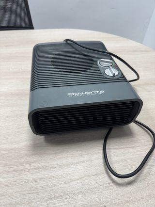 Calentador eléctrico de la marca Rowenta en color negro. Diseñado para ofrecer confort y un funcionamiento silencioso. - Diseño compacto y moderno. - Controles de fácil acceso en la parte superior. - Rejilla frontal de protección.