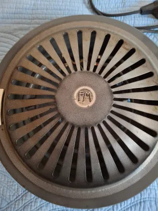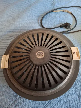 Brasero eléctrico de la marca FM. Ideal para calentar espacios. - Diseño circular con rejilla protectora. - Dos asas laterales para facilitar su transporte. - Cable de alimentación incluido.