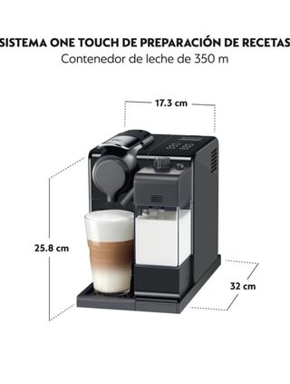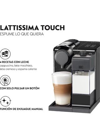 Nespresso lattissima touch tiene un sistema patentado para preparar capuchino y latte macchiato con solo tocar un botón. Esta máquina de café con espumador de leche tiene seis botones táctiles para tu bebida favorita: espresso, latte largo y cremoso, capuchino, latte macchiato y leche caliente. Todas las bebidas se pueden personalizar y memorizar variando la cantidad de leche y café. Tiempo de calentamiento reducido, listo en aproximadamente 25 segundos. Se apaga automáticamente después de 9 minutos.