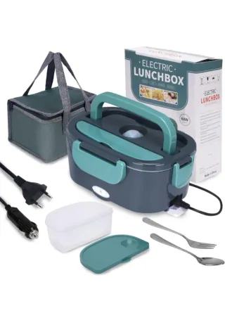 Fiambrera eléctrica con una capacidad de 1.5 litros y una potencia de 60W, ideal para calentar tu comida. - Incluye bolsa de transporte. - Incluye cubiertos (cuchara y tenedor). - Incluye adaptadores para coche y enchufe. - Recipiente interior de acero inoxidable.22 largo 15 ancho y 10.5 alto.