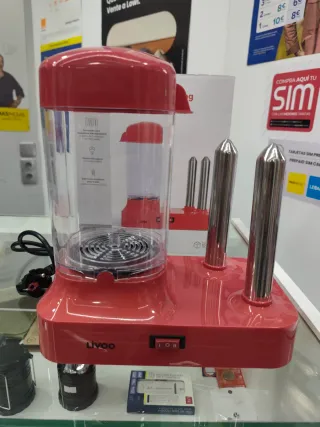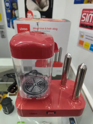 Máquina para preparar perritos calientes al Vapor de la marca Livoo. - Diseño en color rojo. - Incluye dos pinchos metálicos para calentar. - Depósito transparente para cocinar. Nueva.