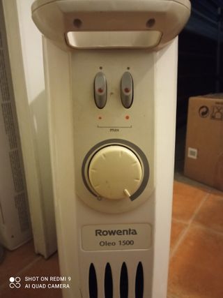 Calentador de aceite Rowenta modelo Oleo 1500. - Color blanco. - Panel de control con dos interruptores y dial. - Indicador de nivel máximo.