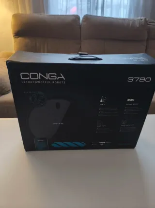 Robot aspirador Conga 3790 de Cecotec. Diseñado para una limpieza potente y eficiente. - Aspira, friega, barre y pasa la mopa. - Tecnología de navegación inteligente por habitaciones. - Cepillo especial para suciedad incrustada. - Control mediante app móvil. Sólo usada una vez para probarla, funciona correctamente pero en mi casa, al tener las tuberías de la calefacción por fuera, no llega bien y no puede cumplir su función. Está en su caja original, con los recambios e instrucciones.
