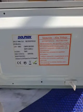 Microondas marca Dolphin, modelo DM-17-900-CGG. - Potencia de microondas: 1200W. - Potencia de grill: 900W. - Salida: 700W. - Frecuencia: 2450MHz. - Dimensiones: 262mm (Alto) x 452mm (Ancho) x 335mm (Fondo). - Certificación CE y RoHS.NO HAGO ENVIOS