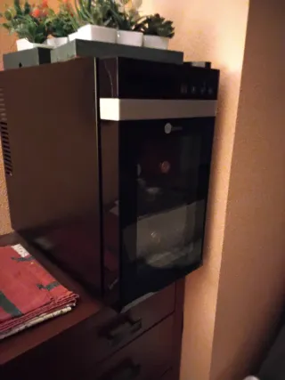 Vinoteca de diseño moderno con capacidad para 6 botellas. - Color negro y detalles plateados. - Puerta de cristal. - Panel de control digital.